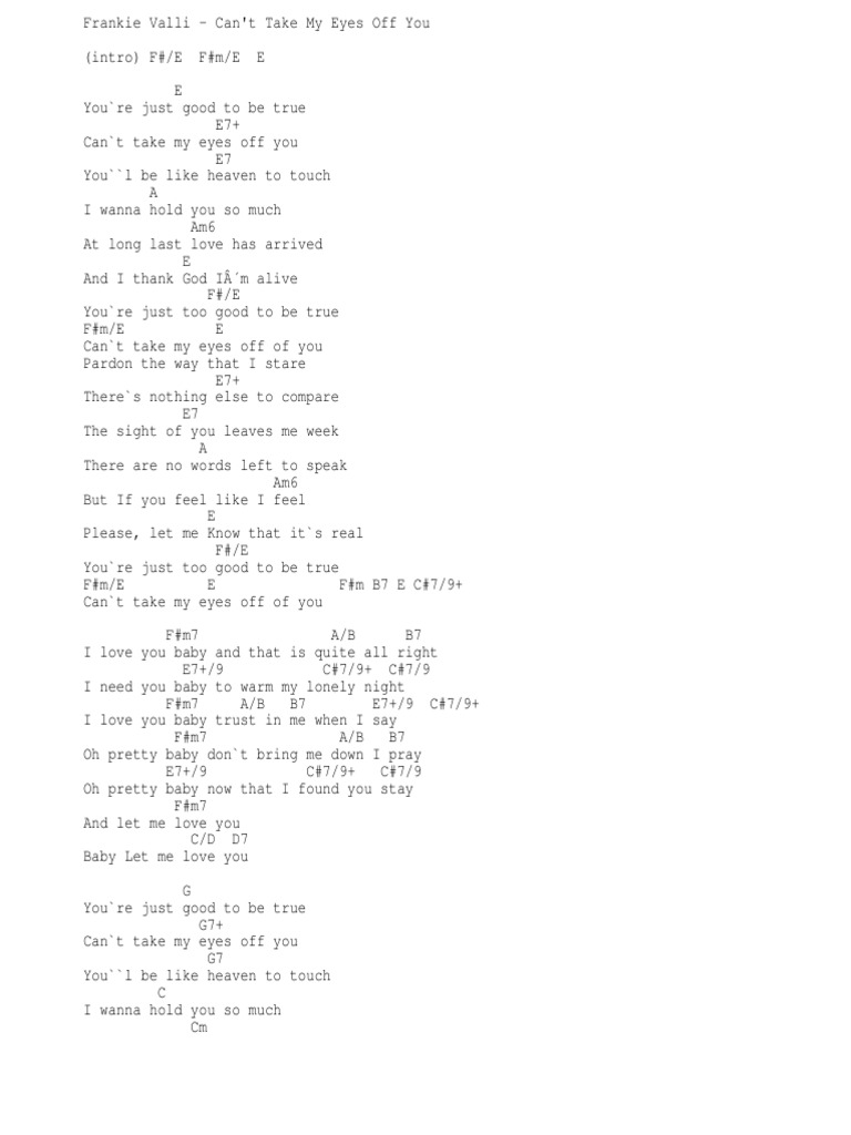 Cant Take My Eyes Chord - Frankie Valli & The Four Seasons - Can't Take My Eyes Off Of You sheet music for piano solo - Cmaj7 there's nothing else to compare.. Check out the tab ». C you're just too good to be true cmaj7 can't take my eyes off you c you feel like heaven to touch g i wanna hold you so much em at long last love has arrived c and i thank god i'm alive d d7 you're just too good to be true c can't take my. (same chords as verse) you're just too good to be true can't take my eyes off you you'd be like heaven to touch i. D7sus4 you'd be like heaven to touch. C pardon the way that i stare.